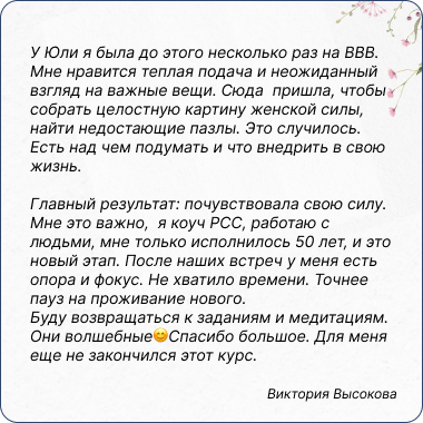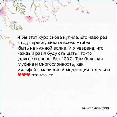 «Вы научитесь намного точнее выбирать своё и отставлять в сторону не своё, перестанете стесняться своего Блеска, Ума, Юмора, Тела, Идей, Желаний.