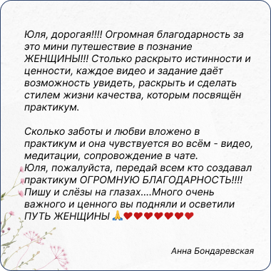 Я уверена - именно сейчас время создания нового женского образа, в котором есть все: сила, ум, уязвимость, нежность, лёгкость, устойчивость и масштаб. Жертвовать хоть чем-то из этого  преступно. Пришла эпоха женщин вне возраста, времени, установок и правил.»